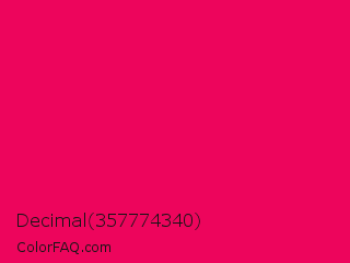 Decimal 357774340 Color is a normal rose color and the nearest color is Razzmatazz Crayola #e30b5c. Hex code #ed055c and RGB value is rgb(237,5,92). In RGB color space, this color is composed of 93% red, 2% green, 36% blue, In CMYK color space, this color is composed of 0% cyan, 98% magenta, 61% yellow , 7% black , In HSL color space, this color has a hue angle of 338° , 96% saturation and 47% lightness.