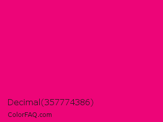 Decimal 357774386 Color is a normal rose color and the nearest color is Red Purple #e40078. Hex code #ed0578 and RGB value is rgb(237,5,120). In RGB color space, this color is composed of 93% red, 2% green, 47% blue, In CMYK color space, this color is composed of 0% cyan, 98% magenta, 49% yellow , 7% black , In HSL color space, this color has a hue angle of 330° , 96% saturation and 47% lightness.