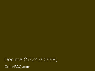 Decimal 5724390998 Color is a very dark yellow color and the nearest color is Madras #3f3002. Hex code #423800 and RGB value is rgb(66,56,0). In RGB color space, this color is composed of 26% red, 22% green, 0% blue, In CMYK color space, this color is composed of 0% cyan, 15% magenta, 100% yellow , 74% black , In HSL color space, this color has a hue angle of 51° , 100% saturation and 13% lightness.