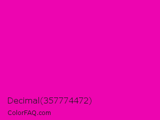 Decimal 357774472 Color is a normal magenta color and the nearest color is Hollywood Cerise #f400a1. Hex code #ed05b0 and RGB value is rgb(237,5,176). In RGB color space, this color is composed of 93% red, 2% green, 69% blue, In CMYK color space, this color is composed of 0% cyan, 98% magenta, 26% yellow , 7% black , In HSL color space, this color has a hue angle of 316° , 96% saturation and 47% lightness.