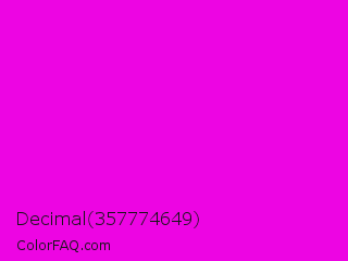 Decimal 357774649 Color is a normal magenta color and the nearest color is Purple Pizzazz #ff00cc. Hex code #ed05e3 and RGB value is rgb(237,5,227). In RGB color space, this color is composed of 93% red, 2% green, 89% blue, In CMYK color space, this color is composed of 0% cyan, 98% magenta, 4% yellow , 7% black , In HSL color space, this color has a hue angle of 303° , 96% saturation and 47% lightness.