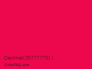 Decimal 357777751 Color is a normal rose color and the nearest color is Red Ribbon #ed0a3f. Hex code #ed084d and RGB value is rgb(237,8,77). In RGB color space, this color is composed of 93% red, 3% green, 30% blue, In CMYK color space, this color is composed of 0% cyan, 97% magenta, 68% yellow , 7% black , In HSL color space, this color has a hue angle of 342° , 93% saturation and 48% lightness.