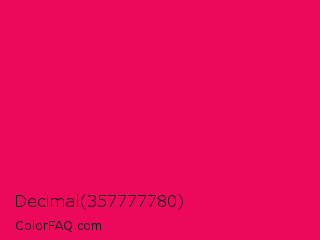 Decimal 357777780 Color is a normal rose color and the nearest color is Raspberry #e30b5d. Hex code #ed085e and RGB value is rgb(237,8,94). In RGB color space, this color is composed of 93% red, 3% green, 37% blue, In CMYK color space, this color is composed of 0% cyan, 97% magenta, 60% yellow , 7% black , In HSL color space, this color has a hue angle of 337° , 93% saturation and 48% lightness.