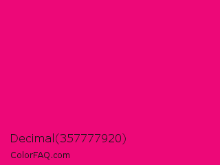 Decimal 357777920 Color is a normal rose color and the nearest color is Red Purple #e40078. Hex code #ed0878 and RGB value is rgb(237,8,120). In RGB color space, this color is composed of 93% red, 3% green, 47% blue, In CMYK color space, this color is composed of 0% cyan, 97% magenta, 49% yellow , 7% black , In HSL color space, this color has a hue angle of 331° , 93% saturation and 48% lightness.