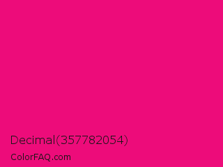 Decimal 357782054 Color is a normal rose color and the nearest color is Red Purple #e40078. Hex code #ed0c7a and RGB value is rgb(237,12,122). In RGB color space, this color is composed of 93% red, 5% green, 48% blue, In CMYK color space, this color is composed of 0% cyan, 95% magenta, 49% yellow , 7% black , In HSL color space, this color has a hue angle of 331° , 90% saturation and 49% lightness.