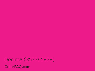 Decimal 357795878 Color is a normal rose color and the nearest color is Barbie Pink #e0218a. Hex code #ed1a8a and RGB value is rgb(237,26,138). In RGB color space, this color is composed of 93% red, 10% green, 54% blue, In CMYK color space, this color is composed of 0% cyan, 89% magenta, 42% yellow , 7% black , In HSL color space, this color has a hue angle of 328° , 85% saturation and 52% lightness.