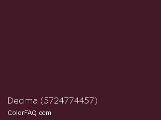 Decimal 5724774457 Color is a very dark rose color and the nearest color is Crater Brown #462425. Hex code #431827 and RGB value is rgb(67,24,39). In RGB color space, this color is composed of 26% red, 9% green, 15% blue, In CMYK color space, this color is composed of 0% cyan, 64% magenta, 42% yellow , 74% black , In HSL color space, this color has a hue angle of 339° , 47% saturation and 18% lightness.