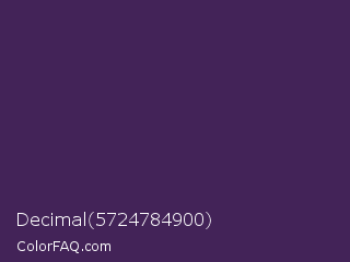 Decimal 5724784900 Color is a dark purple color and the nearest color is Bossanova #4e2a5a. Hex code #432358 and RGB value is rgb(67,35,88). In RGB color space, this color is composed of 26% red, 14% green, 35% blue, In CMYK color space, this color is composed of 24% cyan, 60% magenta, 0% yellow , 65% black , In HSL color space, this color has a hue angle of 276° , 43% saturation and 24% lightness.