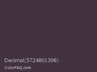 Decimal 5724801398 Color is a dark magenta color and the nearest color is Ship Gray #3e3a44. Hex code #433340 and RGB value is rgb(67,51,64). In RGB color space, this color is composed of 26% red, 20% green, 25% blue, In CMYK color space, this color is composed of 0% cyan, 24% magenta, 4% yellow , 74% black , In HSL color space, this color has a hue angle of 311° , 14% saturation and 23% lightness.