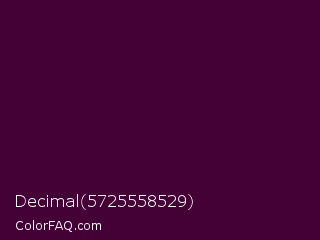 Decimal 5725558529 Color is a very dark magenta color and the nearest color is Barossa #44012d. Hex code #440135 and RGB value is rgb(68,1,53). In RGB color space, this color is composed of 27% red, 0% green, 21% blue, In CMYK color space, this color is composed of 0% cyan, 99% magenta, 22% yellow , 73% black , In HSL color space, this color has a hue angle of 313° , 97% saturation and 14% lightness.