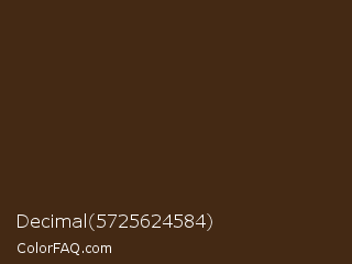 Decimal 5725624584 Color is a very dark orange color and the nearest color is Brown Derby #492615. Hex code #442914 and RGB value is rgb(68,41,20). In RGB color space, this color is composed of 27% red, 16% green, 8% blue, In CMYK color space, this color is composed of 0% cyan, 40% magenta, 71% yellow , 73% black , In HSL color space, this color has a hue angle of 26° , 55% saturation and 17% lightness.