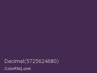 Decimal 5725624680 Color is a dark purple color and the nearest color is Bossanova #4e2a5a. Hex code #442950 and RGB value is rgb(68,41,80). In RGB color space, this color is composed of 27% red, 16% green, 31% blue, In CMYK color space, this color is composed of 15% cyan, 49% magenta, 0% yellow , 69% black , In HSL color space, this color has a hue angle of 282° , 32% saturation and 24% lightness.