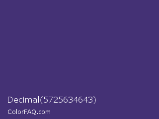 Decimal 5725634643 Color is a normal indigo color and the nearest color is Minsk #3f307f. Hex code #443175 and RGB value is rgb(68,49,117). In RGB color space, this color is composed of 27% red, 19% green, 46% blue, In CMYK color space, this color is composed of 42% cyan, 58% magenta, 0% yellow , 54% black , In HSL color space, this color has a hue angle of 257° , 41% saturation and 33% lightness.