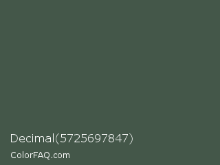 Decimal 5725697847 Color is a dark green color and the nearest color is Gray Asparagus #465945. Hex code #445749 and RGB value is rgb(68,87,73). In RGB color space, this color is composed of 27% red, 34% green, 29% blue, In CMYK color space, this color is composed of 22% cyan, 0% magenta, 16% yellow , 66% black , In HSL color space, this color has a hue angle of 136° , 12% saturation and 30% lightness.