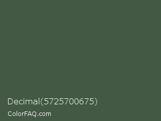 Decimal 5725700675 Color is a normal green color and the nearest color is Gray Asparagus #465945. Hex code #445943 and RGB value is rgb(68,89,67). In RGB color space, this color is composed of 27% red, 35% green, 26% blue, In CMYK color space, this color is composed of 24% cyan, 0% magenta, 25% yellow , 65% black , In HSL color space, this color has a hue angle of 117° , 14% saturation and 31% lightness.