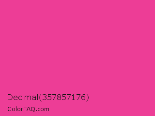 Decimal 357857176 Color is a normal rose color and the nearest color is Rose Bonbon #f9429e. Hex code #ed3d96 and RGB value is rgb(237,61,150). In RGB color space, this color is composed of 93% red, 24% green, 59% blue, In CMYK color space, this color is composed of 0% cyan, 74% magenta, 37% yellow , 7% black , In HSL color space, this color has a hue angle of 330° , 83% saturation and 58% lightness.