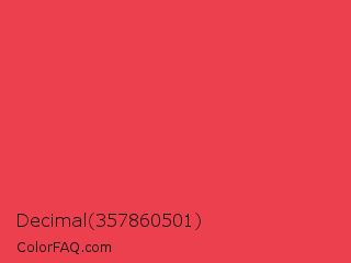 Decimal 357860501 Color is a normal red color and the nearest color is Desire #ea3c53. Hex code #ed404f and RGB value is rgb(237,64,79). In RGB color space, this color is composed of 93% red, 25% green, 31% blue, In CMYK color space, this color is composed of 0% cyan, 73% magenta, 67% yellow , 7% black , In HSL color space, this color has a hue angle of 355° , 83% saturation and 59% lightness.