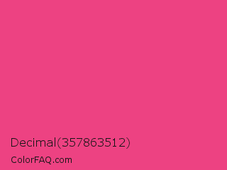 Decimal 357863512 Color is a normal rose color and the nearest color is Cerise Pink #ec3b83. Hex code #ed4282 and RGB value is rgb(237,66,130). In RGB color space, this color is composed of 93% red, 26% green, 51% blue, In CMYK color space, this color is composed of 0% cyan, 72% magenta, 45% yellow , 7% black , In HSL color space, this color has a hue angle of 338° , 83% saturation and 59% lightness.