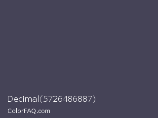 Decimal 5726486887 Color is a dark indigo color and the nearest color is Gun Powder #414257. Hex code #454357 and RGB value is rgb(69,67,87). In RGB color space, this color is composed of 27% red, 26% green, 34% blue, In CMYK color space, this color is composed of 21% cyan, 23% magenta, 0% yellow , 66% black , In HSL color space, this color has a hue angle of 246° , 13% saturation and 30% lightness.