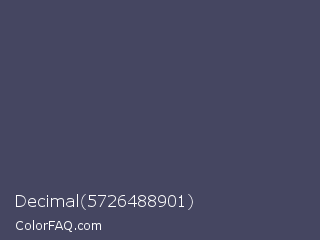 Decimal 5726488901 Color is a normal blue color and the nearest color is Mulled Wine #4e4562. Hex code #454661 and RGB value is rgb(69,70,97). In RGB color space, this color is composed of 27% red, 27% green, 38% blue, In CMYK color space, this color is composed of 29% cyan, 28% magenta, 0% yellow , 62% black , In HSL color space, this color has a hue angle of 238° , 17% saturation and 33% lightness.