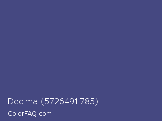 Decimal 5726491785 Color is a normal blue color and the nearest color is East Bay #414c7d. Hex code #454881 and RGB value is rgb(69,72,129). In RGB color space, this color is composed of 27% red, 28% green, 51% blue, In CMYK color space, this color is composed of 47% cyan, 44% magenta, 0% yellow , 49% black , In HSL color space, this color has a hue angle of 237° , 30% saturation and 39% lightness.