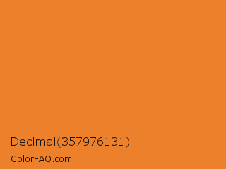 Decimal 357976131 Color is a normal orange color and the nearest color is Cadmium Orange #ed872d. Hex code #ed802b and RGB value is rgb(237,128,43). In RGB color space, this color is composed of 93% red, 50% green, 17% blue, In CMYK color space, this color is composed of 0% cyan, 46% magenta, 82% yellow , 7% black , In HSL color space, this color has a hue angle of 26° , 84% saturation and 55% lightness.