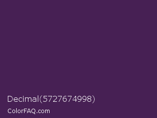 Decimal 5727674998 Color is a dark purple color and the nearest color is Bossanova #4e2a5a. Hex code #472054 and RGB value is rgb(71,32,84). In RGB color space, this color is composed of 28% red, 13% green, 33% blue, In CMYK color space, this color is composed of 15% cyan, 62% magenta, 0% yellow , 67% black , In HSL color space, this color has a hue angle of 285° , 45% saturation and 23% lightness.
