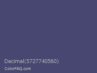 Decimal 5727740560 Color is a normal blue color and the nearest color is Independence #4c516d. Hex code #474772 and RGB value is rgb(71,71,114). In RGB color space, this color is composed of 28% red, 28% green, 45% blue, In CMYK color space, this color is composed of 38% cyan, 38% magenta, 0% yellow , 55% black , In HSL color space, this color has a hue angle of 240° , 23% saturation and 36% lightness.