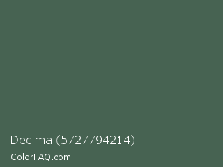 Decimal 5727794214 Color is a normal green color and the nearest color is Nandor #4b5d52. Hex code #476352 and RGB value is rgb(71,99,82). In RGB color space, this color is composed of 28% red, 39% green, 32% blue, In CMYK color space, this color is composed of 28% cyan, 0% magenta, 17% yellow , 61% black , In HSL color space, this color has a hue angle of 144° , 16% saturation and 33% lightness.