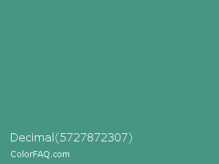 Decimal 5727872307 Color is a normal cyan color and the nearest color is Wintergreen Dream #56887d. Hex code #479685 and RGB value is rgb(71,150,133). In RGB color space, this color is composed of 28% red, 59% green, 52% blue, In CMYK color space, this color is composed of 53% cyan, 0% magenta, 11% yellow , 41% black , In HSL color space, this color has a hue angle of 167° , 36% saturation and 43% lightness.