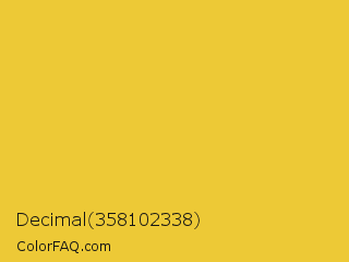 Decimal 358102338 Color is a normal yellow color and the nearest color is Saffron #f4c430. Hex code #edc936 and RGB value is rgb(237,201,54). In RGB color space, this color is composed of 93% red, 79% green, 21% blue, In CMYK color space, this color is composed of 0% cyan, 15% magenta, 77% yellow , 7% black , In HSL color space, this color has a hue angle of 48° , 84% saturation and 57% lightness.