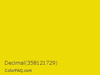 Decimal 358121729 Color is a normal yellow color and the nearest color is Safety Yellow #eed202. Hex code #eddb05 and RGB value is rgb(237,219,5). In RGB color space, this color is composed of 93% red, 86% green, 2% blue, In CMYK color space, this color is composed of 0% cyan, 8% magenta, 98% yellow , 7% black , In HSL color space, this color has a hue angle of 55° , 96% saturation and 47% lightness.