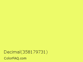 Decimal 358179731 Color is a light yellow color and the nearest color is Canary #f3fb62. Hex code #edfb69 and RGB value is rgb(237,251,105). In RGB color space, this color is composed of 93% red, 98% green, 41% blue, In CMYK color space, this color is composed of 6% cyan, 0% magenta, 58% yellow , 2% black , In HSL color space, this color has a hue angle of 66° , 95% saturation and 70% lightness.