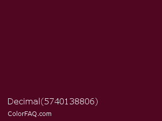 Decimal 5740138806 Color is a very dark rose color and the nearest color is Castro #52001f. Hex code #500520 and RGB value is rgb(80,5,32). In RGB color space, this color is composed of 31% red, 2% green, 13% blue, In CMYK color space, this color is composed of 0% cyan, 94% magenta, 60% yellow , 69% black , In HSL color space, this color has a hue angle of 338° , 88% saturation and 17% lightness.
