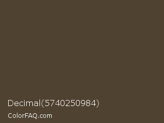 Decimal 5740250984 Color is a dark orange color and the nearest color is Judge Gray #544333. Hex code #504230 and RGB value is rgb(80,66,48). In RGB color space, this color is composed of 31% red, 26% green, 19% blue, In CMYK color space, this color is composed of 0% cyan, 18% magenta, 40% yellow , 69% black , In HSL color space, this color has a hue angle of 34° , 25% saturation and 25% lightness.