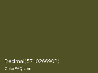 Decimal 5740266902 Color is a dark yellow color and the nearest color is Woodland #4d5328. Hex code #505124 and RGB value is rgb(80,81,36). In RGB color space, this color is composed of 31% red, 32% green, 14% blue, In CMYK color space, this color is composed of 1% cyan, 0% magenta, 56% yellow , 68% black , In HSL color space, this color has a hue angle of 61° , 38% saturation and 23% lightness.