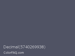 Decimal 5740269938 Color is a normal blue color and the nearest color is Scarpa Flow #585562. Hex code #505364 and RGB value is rgb(80,83,100). In RGB color space, this color is composed of 31% red, 33% green, 39% blue, In CMYK color space, this color is composed of 20% cyan, 17% magenta, 0% yellow , 61% black , In HSL color space, this color has a hue angle of 231° , 11% saturation and 35% lightness.