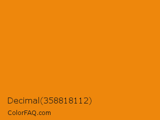 Decimal 358818112 Color is a normal orange color and the nearest color is Tangerine #f28500. Hex code #ee870c and RGB value is rgb(238,135,12). In RGB color space, this color is composed of 93% red, 53% green, 5% blue, In CMYK color space, this color is composed of 0% cyan, 43% magenta, 95% yellow , 7% black , In HSL color space, this color has a hue angle of 33° , 90% saturation and 49% lightness.