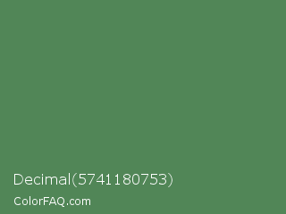 Decimal 5741180753 Color is a normal green color and the nearest color is Middle Green #4d8c57. Hex code #518657 and RGB value is rgb(81,134,87). In RGB color space, this color is composed of 32% red, 53% green, 34% blue, In CMYK color space, this color is composed of 40% cyan, 0% magenta, 35% yellow , 47% black , In HSL color space, this color has a hue angle of 127° , 25% saturation and 42% lightness.