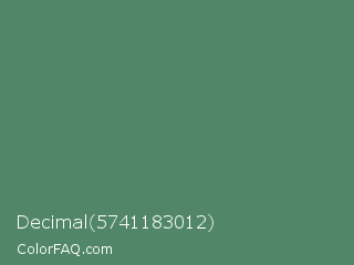 Decimal 5741183012 Color is a normal green color and the nearest color is Spring Leaves #578363. Hex code #518768 and RGB value is rgb(81,135,104). In RGB color space, this color is composed of 32% red, 53% green, 41% blue, In CMYK color space, this color is composed of 40% cyan, 0% magenta, 23% yellow , 47% black , In HSL color space, this color has a hue angle of 146° , 25% saturation and 42% lightness.