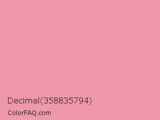 Decimal 358835794 Color is a light red color and the nearest color is Mauvelous #ef98aa. Hex code #ee98ac and RGB value is rgb(238,152,172). In RGB color space, this color is composed of 93% red, 60% green, 67% blue, In CMYK color space, this color is composed of 0% cyan, 36% magenta, 28% yellow , 7% black , In HSL color space, this color has a hue angle of 346° , 72% saturation and 76% lightness.