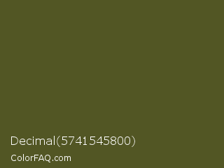 Decimal 5741545800 Color is a dark yellow color and the nearest color is Woodland #4d5328. Hex code #525624 and RGB value is rgb(82,86,36). In RGB color space, this color is composed of 32% red, 34% green, 14% blue, In CMYK color space, this color is composed of 5% cyan, 0% magenta, 58% yellow , 66% black , In HSL color space, this color has a hue angle of 65° , 41% saturation and 24% lightness.