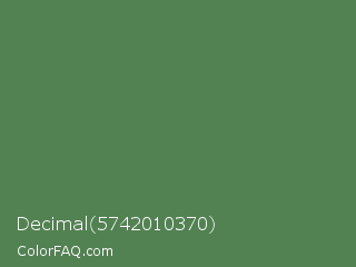 Decimal 5742010370 Color is a normal green color and the nearest color is Hippie Green #53824b. Hex code #528152 and RGB value is rgb(82,129,82). In RGB color space, this color is composed of 32% red, 51% green, 32% blue, In CMYK color space, this color is composed of 36% cyan, 0% magenta, 36% yellow , 49% black , In HSL color space, this color has a hue angle of 120° , 22% saturation and 41% lightness.