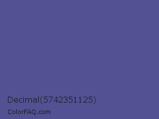 Decimal 5742351125 Color is a normal indigo color and the nearest color is Victoria #534491. Hex code #535193 and RGB value is rgb(83,81,147). In RGB color space, this color is composed of 33% red, 32% green, 58% blue, In CMYK color space, this color is composed of 44% cyan, 45% magenta, 0% yellow , 42% black , In HSL color space, this color has a hue angle of 242° , 29% saturation and 45% lightness.
