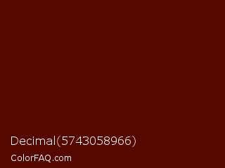 Decimal 5743058966 Color is a very dark red color and the nearest color is Mahogany #4e0606. Hex code #540800 and RGB value is rgb(84,8,0). In RGB color space, this color is composed of 33% red, 3% green, 0% blue, In CMYK color space, this color is composed of 0% cyan, 90% magenta, 100% yellow , 67% black , In HSL color space, this color has a hue angle of 6° , 100% saturation and 16% lightness.