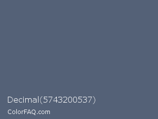 Decimal 5743200537 Color is a normal blue color and the nearest color is Paynes Grey #536878. Hex code #546177 and RGB value is rgb(84,97,119). In RGB color space, this color is composed of 33% red, 38% green, 47% blue, In CMYK color space, this color is composed of 29% cyan, 18% magenta, 0% yellow , 53% black , In HSL color space, this color has a hue angle of 218° , 17% saturation and 40% lightness.