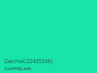 Decimal 22435336 Color is a normal green color and the nearest color is Medium Spring Green #00fa9a. Hex code #17e3a8 and RGB value is rgb(23,227,168). In RGB color space, this color is composed of 9% red, 89% green, 66% blue, In CMYK color space, this color is composed of 90% cyan, 0% magenta, 26% yellow , 11% black , In HSL color space, this color has a hue angle of 163° , 82% saturation and 49% lightness.
