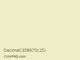 Decimal 358975125 Color is a very light yellow color and the nearest color is Tahuna Sands #eef0c8. Hex code #eeeec7 and RGB value is rgb(238,238,199). In RGB color space, this color is composed of 93% red, 93% green, 78% blue, In CMYK color space, this color is composed of 0% cyan, 0% magenta, 16% yellow , 7% black , In HSL color space, this color has a hue angle of 60° , 53% saturation and 86% lightness.