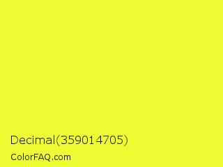 Decimal 359014705 Color is a normal yellow color and the nearest color is Golden Fizz #f5fb3d. Hex code #eefc33 and RGB value is rgb(238,252,51). In RGB color space, this color is composed of 93% red, 99% green, 20% blue, In CMYK color space, this color is composed of 6% cyan, 0% magenta, 80% yellow , 1% black , In HSL color space, this color has a hue angle of 64° , 97% saturation and 59% lightness.