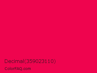 Decimal 359023110 Color is a normal rose color and the nearest color is Red Ribbon #ed0a3f. Hex code #ef044e and RGB value is rgb(239,4,78). In RGB color space, this color is composed of 94% red, 2% green, 31% blue, In CMYK color space, this color is composed of 0% cyan, 98% magenta, 67% yellow , 6% black , In HSL color space, this color has a hue angle of 341° , 97% saturation and 48% lightness.